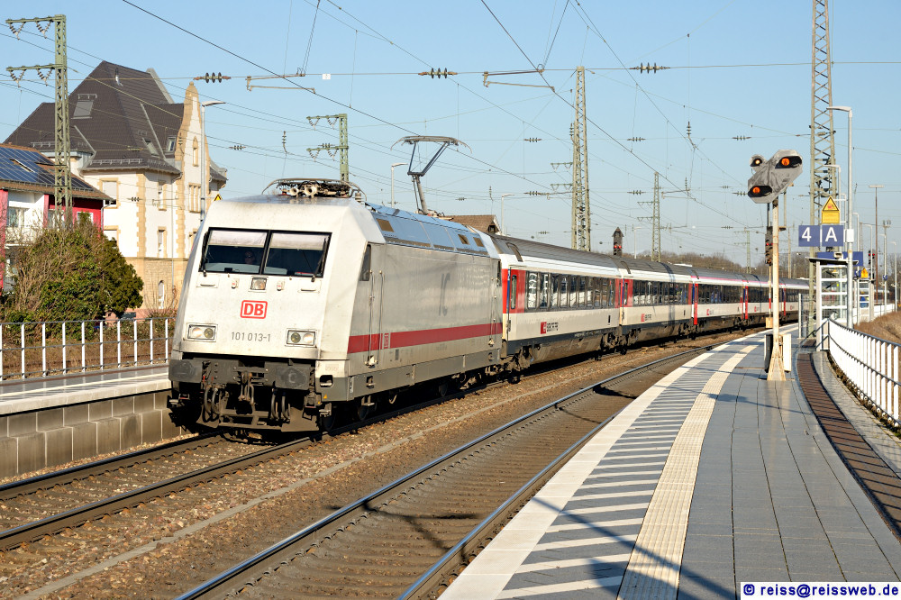 DB 101 013 in "ICE-Farben" führt EC 9 Dortmund - Zürich HB durch Rastatt (01.02.2025).