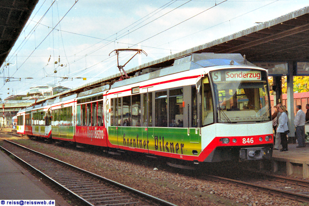 AVG 845 (führend) & 846 stehen in Villingen bereit für die Rückfahrt nach Karlsruhe. Von den einst vier weißen Bistro-Trams (AVG GT8-100D/2S-M 845 - 848) gibt es nur noch den AVG 847 in Weiß, er hat noch seine Bistro-Einrichtung, sie wird aber nicht mehr genutzt. (19./20. September 1998). [Anlaß war 125 Jahre Schwarzwaldbahn]. |
