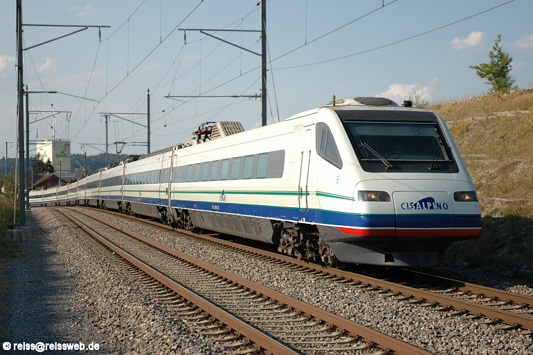 Wegen Streckensperrung Rafz - Neuhausen umgeleiteter CIS 157 Stuttgart - Mailand hat soeben die Station Marthalen passiert (24.07.2006).