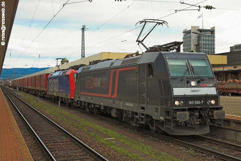 Ein Crossrail-Zug mit 185 566 an der Spitze und SBB 482 021 dahinter hat den Badischen Bahnhof Basel erreicht, in einigen Minuten beginnt die Weiterfahrt nach Weil, wo die schwarze 185 vom Zug gehen wird (03.09.2006).