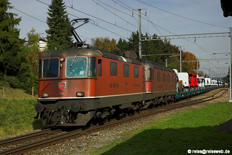 | Abwechslung im (fast) güterzugfreien Sonntag bringt die "Rollende Landstrasse" mit neuen IVECO-LKW von Einsingen nach Ospidaletto. Auch die Wagen waren entweder komplett neu oder neu lackiert. Am Zug waren Re 4/4 II 11174 u. Re 6/6 11657 (Lottstetten, 22.10.2006). |