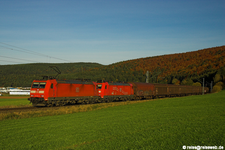 Am späten Sonntagnachmittag bringt 185 094 ihre "Kollegin" 185 090 und einen Güterzug von Kornwestheim nach Wolfurt (A), aufgenommen wurden sie am südlichen Stadtrand von Tuttlingen (22.10.2006).