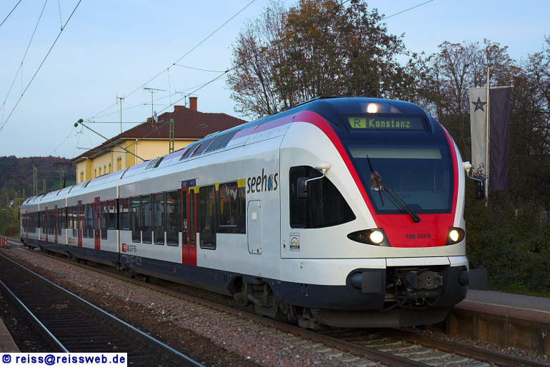 Ein Flirt der Baureihe 526 (526 651) steht in Engen zur Rückfahrt nach Konstanz bereit (22.10.2006).