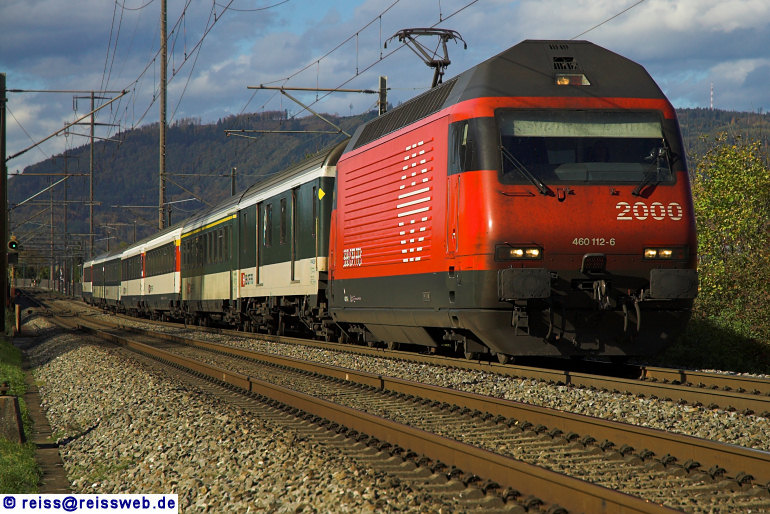 460 112 nimmt mit ihrem Schnellzug nach Zürich die Bözberg-Nordrampe in Angriff, aufgenommen wurde sie bei Eiken (24.10.2006).