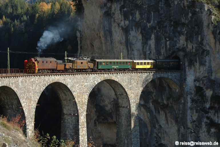 | Eine andere Sicht auf den Sonderzug mit RHB Xrot 9213 und Ge 6/6 I 415 beim Überqueren des Landwasserviadukts: Bei diesem Fotohalt konnten im Zug mitreisende Teilnehmer und Teilnehmer der RhB-Wanderwoche exklusiv auf Gleisebene fotografieren (27.10.2006). |