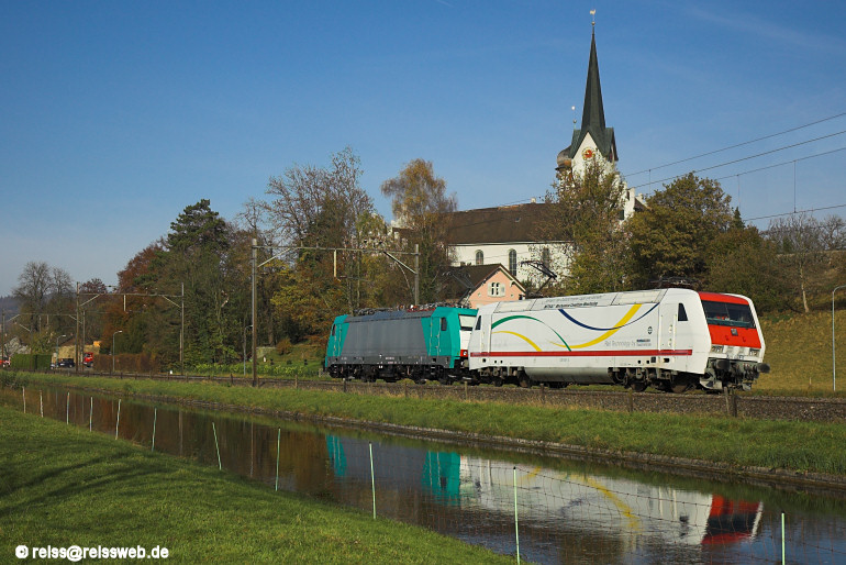 Auf der Strecke Weinfelden - Romanshorn, die gerne zu Messfahrten herangezogen wird, waren am 10.11.2006 die für ATC vorgesehene E 186 101 und die Bombardier-eigene 128 001 unterwegs, aufgenommen am Industriekanal in Bürglen (TG).