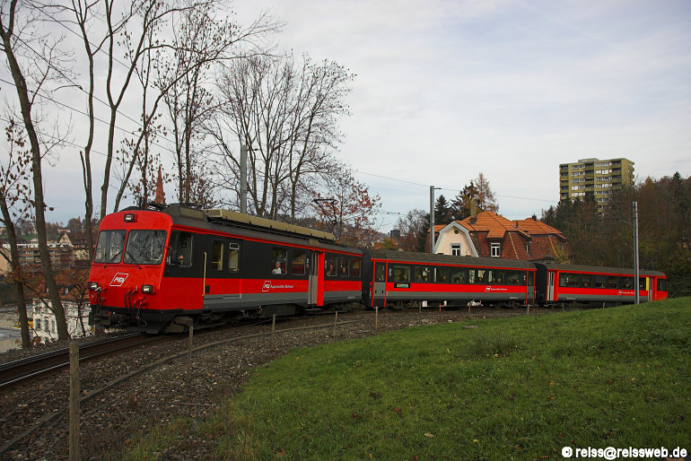 | Zwischen St. Gallen und Appenzell gibt es einen knapp 1 km langen Zahnstangenabschnitt, der durch eine gestrecktere Linienführung oder einen Tunnel ersetzt werden soll. Am 19.11.2006 passiert BDeh 4/4 Nr. 13 die Ruckhaldenkurve in St. Gallen (30 m Radius, 85 o/oo). |