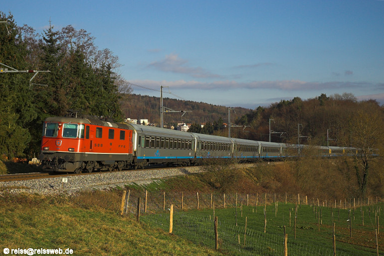 | Neu seit Fahrplanwechsel 06/07 wird ein 2. Eurocity mit CISALPINO-Wagen ab Schaffhausen geführt, Re 4/4 II 11195 bringt am 19.12.2006 EC 175 "Cinque Terre" bis nach Zürich, Ziel des Zuges ist Livorno. Die Aufnahme entstand zwischen Neuhausen u. Altenburg-Rheinau. |