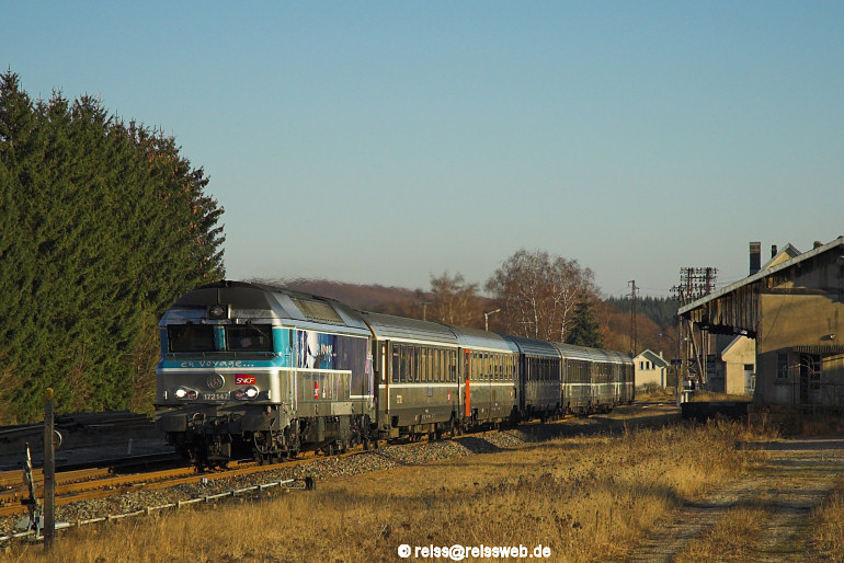 Nur kurz unterbricht das Motorengeräusch der CC 72147 mit Corail 1844 nach Paris Est die Ruhe im Bahnhof Champagney, der nächste Zug wird erst nach Sonnenuntergang den Bahnhof passieren (20.12.2006).