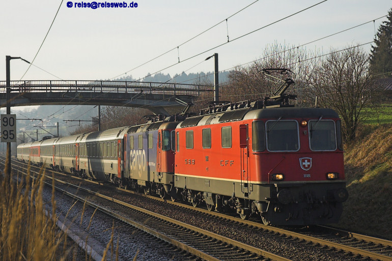 EC 195 Zürich - München wurde am 29.12.2006 mit 2x Re 4/4 II geführt, 11181 und die von SBB Cargo angemietete 421 395 teilten sich diese Aufgabe, die Aufnahme entstand zwischen Schottikon und Elgg.