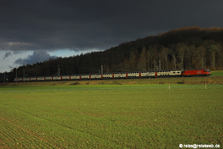 Licht und Schatten lagen am 03.01.2007 eng beieinander, als 460 053 am Schluss einer IC 2000-Garnitur von Zürich nach Schaffhausen bei Rafz unterwegs war.