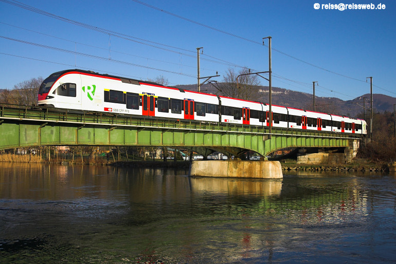 Ein Regio-Flirt überquert mit dem nur an Samstagen u. Sonntagen verkehrenden Regionalzug R 6834 Olten - Solothurn die Aarebrücke bei Wangen (13.01.2007).