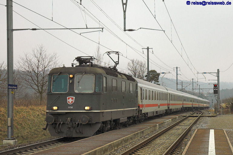Für den am 01.02.2007 ausgefallenen ICE 185 wurde eine Ersatzgarnitur ab Stuttgart gefahren, von Singen bis Zürich führte die grüne Re 4/4 II 11158 den Zug (einschließlich DB-Steuerwagen). Die Aufnahme entstand in Altenburg-Rheinau.