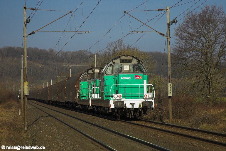 Für einen Samstagmorgen relativ dichten Güterverkehr bot die Strecke Nancy - Chalindrey - Dijon am 03.02.2007, eine Doppeltraktion BB 69400 (die Franzosen würden es UM = Unité multiple nennen) war nördlich Chalindrey Richtung Süden unterwegs.