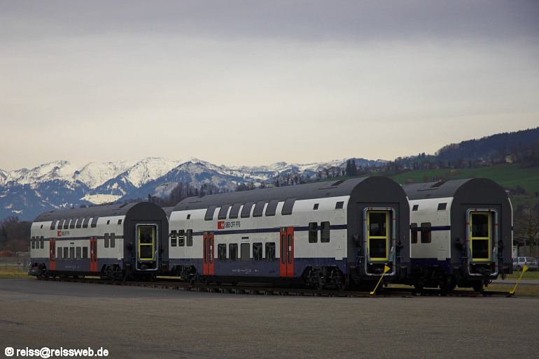 Im Werk Altenrhein der Fa. Stadler wird bei den DTZ-Zwischenwagen der Innenausbau durchgeführt, für die angelieferten Wagen wurde eine provisorische Abstellmöglichkeit im Werksgelände geschaffen (14.02.2007).