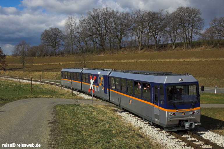 Pressefahrt des künftigen OSE-Triebwagens auf der Öchsle-Strecke - in der Nähe der Ortschaft Sulmingen gab es einen Fotohalt mit Scheinanfahrt (02.03.2007)