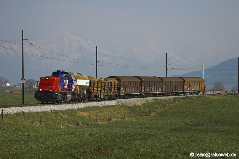 Die in Romont stationierte Am 843 087 hat am 16.03.2007 noch einige Wagen aus dem Militärdepot Sâles an die Übergabe aus Bulle angehängt und fährt nun weiter nach Romont. Bis Anfang Dezember 2006 wurden diese Wagen mit einem