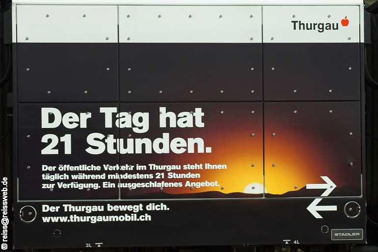 | GTW 2/6 526 704 ist neuer Werbeträger für den Kanton Thurgau - unter dem generellen Motto "Der Thurgau bewegt dich" wird für ein tägliches ÖV-Angebot von mindestens 21 Stunden geworben. Die andere Seite des Fahrzeugs siehe hier (Bettwiesen, 18.03.2007). |