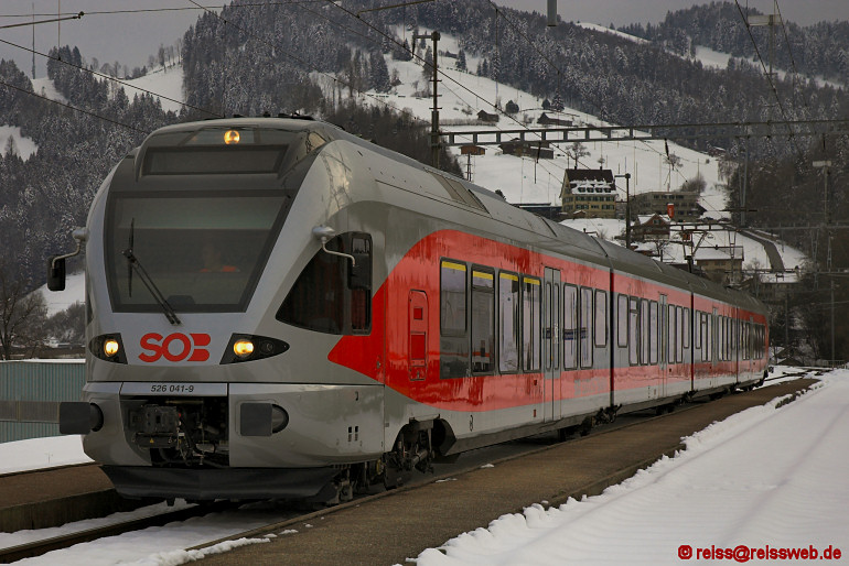 Noch nicht im fahrplanmässigen Einsatz ist SOB-Flirt 526 041 am 22.03.2007 zwischen Art-Goldau u. Herisau unterwegs, aufgenommen wurde er in Lichtensteig (SG).