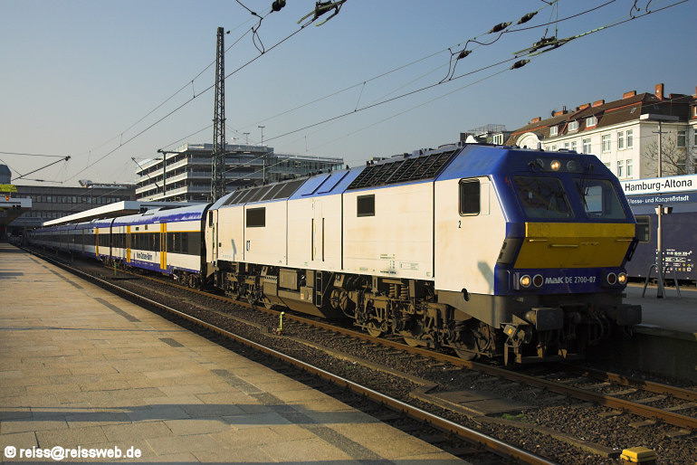 | Die Maschinen des Typs DE 2700 wurden von der MaK nach Norwegen geliefert. Wegen vieler Probleme wurden die Loks zurückgenommen und kamen nach Einsätzen in Luxembourg schliesslich zur NOB, die sie im Verkehr Hamburg - Sylt einsetzt (Hamburg-Altona, 29.03.2007). |