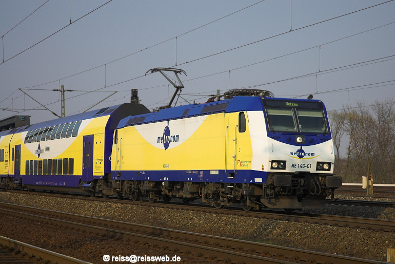 Metronom ME 146-01 hat mit ihrer Garnitur gerade die Süderelbbrücken passiert (Hamburg, 31.03.2007).