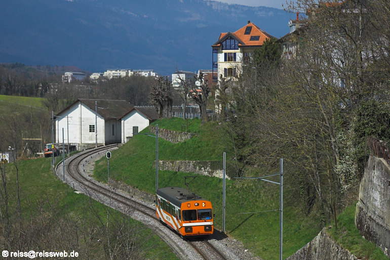 OC Be 2/2 verlässt Orbe Gare und fährt hinunter nach Charvonay (02.04.2007).