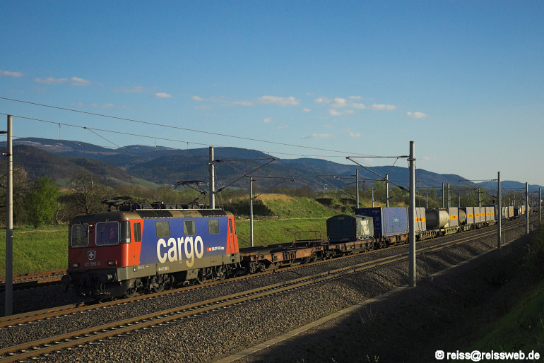 SBB Cargo 421 396 führt am 06.04.2007 bei Sinzheim einen Containerzug nordwärts.