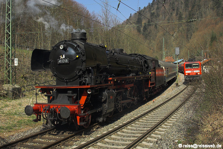 41 018 war von Donaueschingen bis Freiburg Hbf Schlusslok des Sonderzuges Konstanz - Freiburg - Basel - Konstanz. Aufnahme bei der Durchfahrt durch den Bhf Hirschsprung (08.04.2007).
