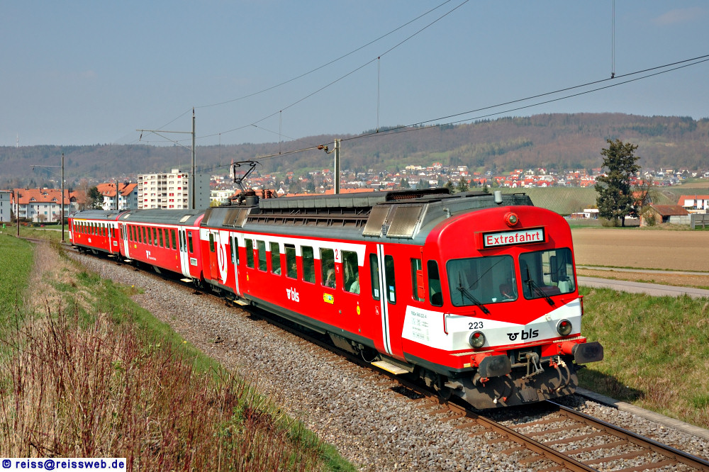 Vor der Kulisse von Diessenhofen präsentiert sich auch der Triebwagen des BLS-Extrazuges (RBDe 566 223) in der Sonne (08.04.2007).