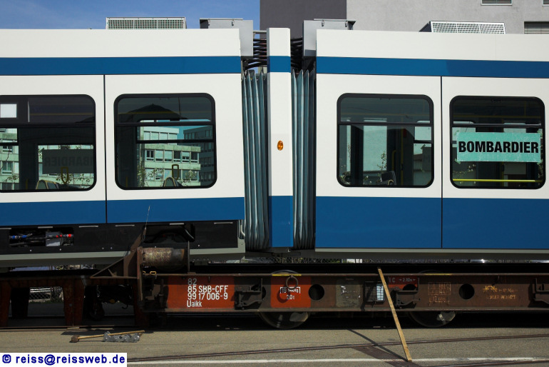 Der 1. Kastenteil des Cobra-Trams hat den Bahnwagen bereits verlassen und befindt sich im Gefälle der speziellen Rampe (Zürich, 13.04.2007).