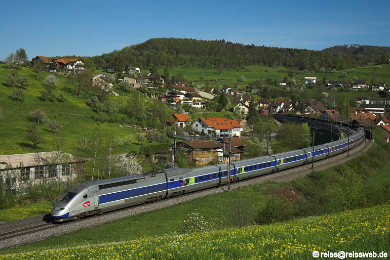 Zur Vorbereitung auf den Fahrplanwechsel im Sommer 07 wurden gelegentlich TGV-POS-Garnituren nach Zürich gebracht, dabei wurde auch über den Bözberg gefahren. TGV 4401 kehrt am 17.04.07 von Zürich nach Basel zurück und wurde bei Zeihen aufgenommen.