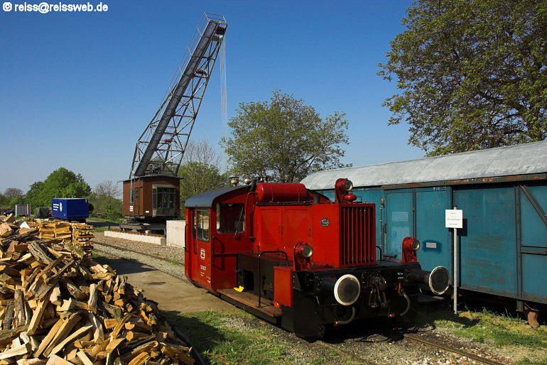 | Am 01.05.2007 wurde bei der Wutachtalbahn ein Portaldrehkran zur Bekohlung der Dampfloks offiziell in Betrieb genommen - ursprünglicher Standort war der Seehafen Konstanz. Köf II 323 627 der WTB genießt die Ruhe des Maimorgens vor dem Lokschuppen in Fützen. |