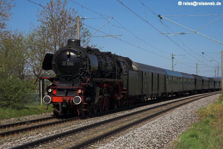 Erstes Zusammentreffen mit 01 1066, die einen Sonderzug von Frankfurt nach Konstanz bzw. weiter nach Arbon bringt. Die Aufnahme entstand am 01.05.2007 in Neudingen (zwischen Donaueschingen und Geisingen gelegen).