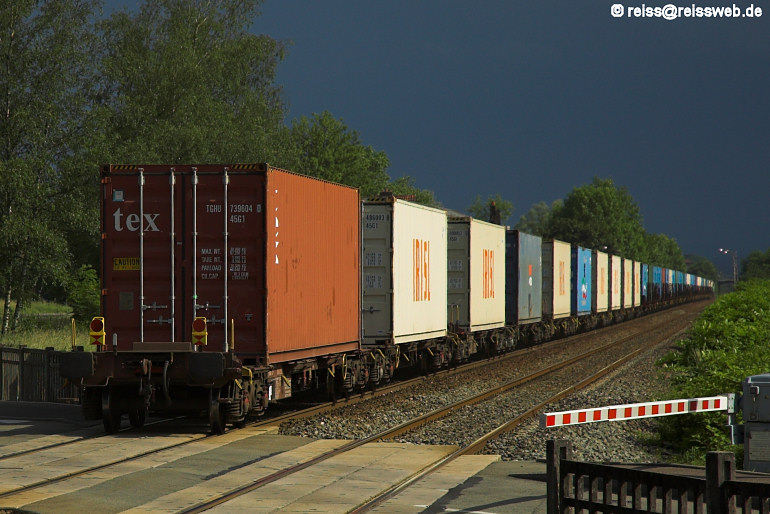 Der Containerzug Vesoul - Bantzenheim hat eine beachtliche Länge - Blick in Richtung Belfort, das schon unter dunklen Wolken liegt (Valdoie, 24.05.2007).