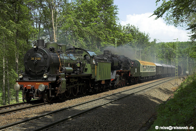 In der Nähe des ehemaligen Bahnhofs Talmühle (zwischen Hattingen u. Engen gelegen) sind 38 3199, 50 3501 und 64 419 mit ihrem Sonderzug unterwegs (26.05.2007).