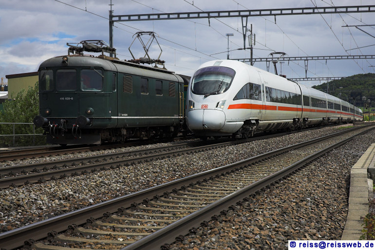 Während Re 4/4 I 416 628 auf dem Nebengleis wartet, passiert ICE 183 Stuttgart - Zürich in voller Fahrt den Bahnhof Rafz. Weitere Bilder von den aktuellen Einsätzen der Re 4/4 I gibt es in
