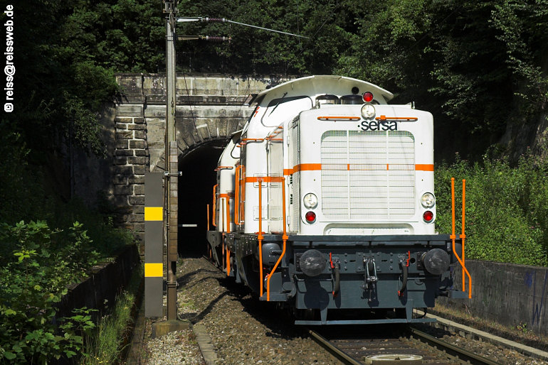 Eine Doppel-Lz der Firma SERSA, bestehend aus den Loks Am 847 957 "Lotti" und Am 847 951 "Gretli II" verlässt den Tunnel zwischen Bülach und Embrach-Rorbas an der Strecke Bülach - Winterthur (20.07.2007).