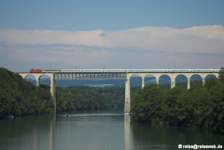 EC 175 Schaffhausen - Livorno hat am 20.07.2007 einen zusätzlichen Wagen aus dem Bestand des Zürcher Nahverkehrs dabei, mit einer Re 4/4 II der 1. Bauserie an der Spitze überquert er die Rheinbrücke Eglisau.