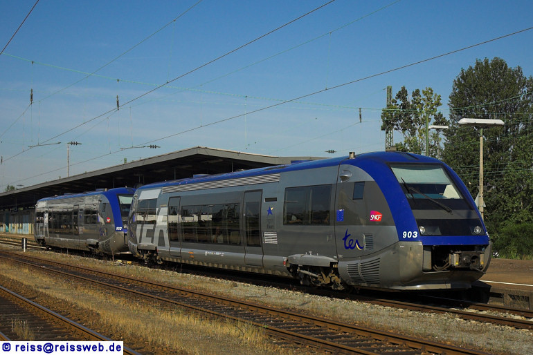 2 Triebwagen der SNCF-Reihe X 73900 mit Deutschland-Zulassung verlassen am 01.08.2007 den Bahnhof Kehl Richtung Offenburg.