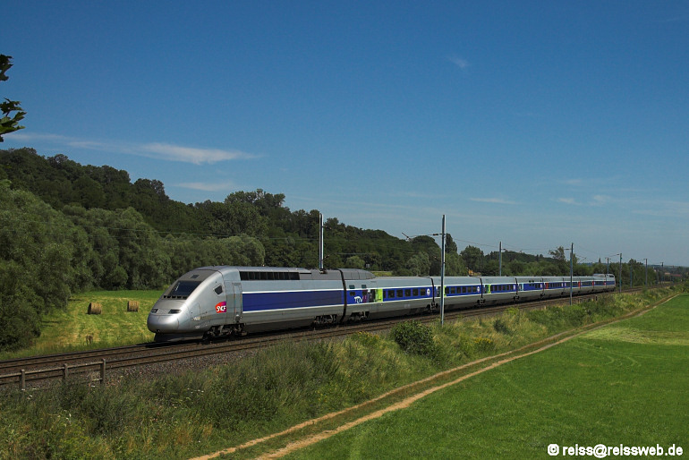 Zwischen Wilwisheim u. Dettwiller wurde TGV 9574 Stuttgart - Paris aufgenommen. Vor 1 3/4 Stunden in Stuttgart gestartet, wird er bis Paris nur noch knapp 2 Stunden unterwegs sein (01.08.2007).