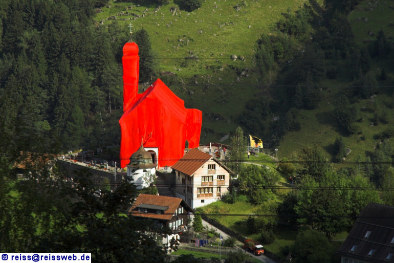 Bei der Heimfahrt von Göschenen konnte die für das Jubiläum in rote Stoffbahnen gekleidete Wassener Kirche fotografiert werden (08.09.2007).