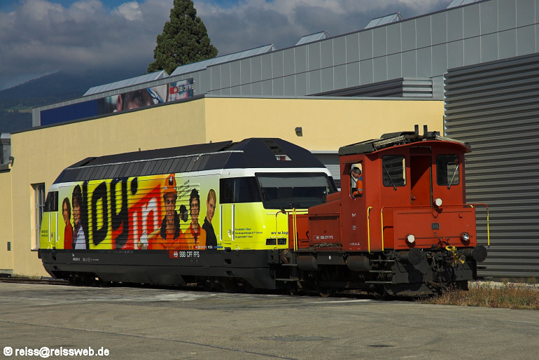 Mit einem Tm III wurde 460 053 "Login" aus dem fahrdratlosen Abschnitt zurück unter die Fahrleitung gezogen (Yverdon, 12.09.2007).