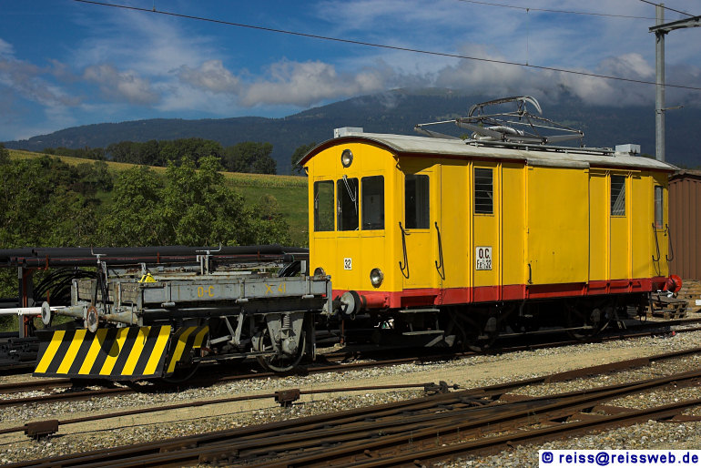 Eine Rarität im Fahrzeugbestand der Orbe-Chavornay-Bahn (OC) ist der Motortriebwagen Fe 2/2 32 aus dem Jahre 1902, der zusammen mit einem ebenso interessanten Schneepflug in Orbe auf seine nächsten Einsätze wartet (12.09.2007).