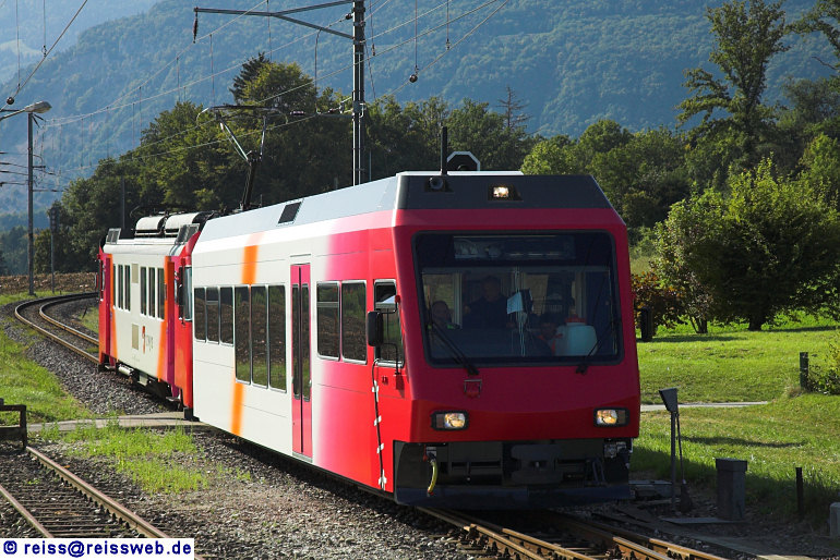Auf einer seiner ersten Probefahrten (zusammen mit Be 4/4 II Nr. 2) konnte der gerade abgelieferte Steuerwagen Bt 55 bei der Einfahrt in Essert-sous-Champvent fotografiert werden (12.09.2007).