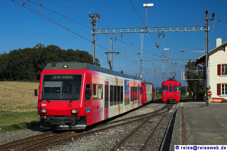 den Bahnhof Richtung Yverdon, während GTW Be 2/6 Nr. 2001 weiter bergauf Richtung Ste-Croix fährt (12.09.2007).