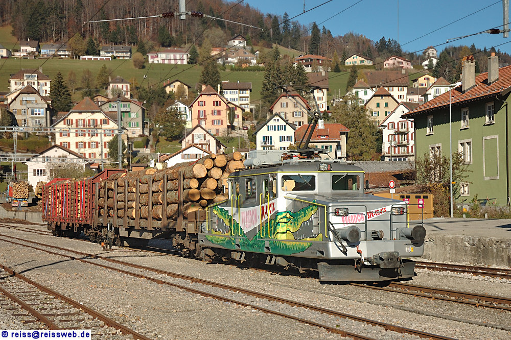 TRAVYS Ge 4/4 21 wartet mit zwei Holzwagen auf die Abfahrt nach Yverdon - die Ge 4/4 wird noch Vorspann durch Be 4/4 2 erhalten (Ste-Croix, 01.11.2007).