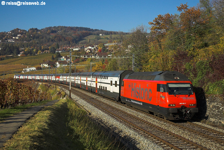 Hoch über dem Genfer See wurde 460 102 "Historic" mit IC 729 Genf Flughafen - St. Gallen aufgenommen (Bossière, 01.11.2007).