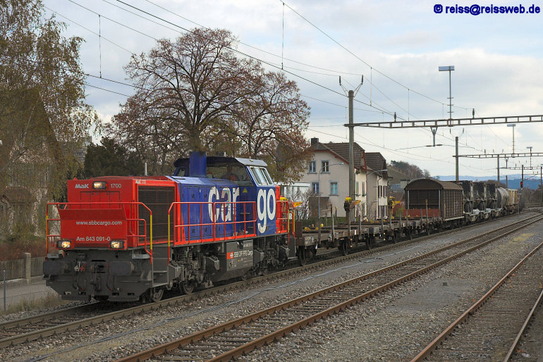 Am 843 091 kehrt mit dem werktäglichen Übergabegüterzug aus Kreuzlingen nach Schaffhausen zurück - am 13.11.2007 hat der Zug eine beachtliche Länge mit einer bunten Mischung an Wagen (Aufnahme in der Station Feuerthalen).