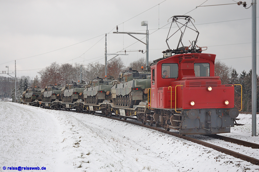 Zum Waffenplatz Bure gehört ein Stationstraktor (Te 216 924, baugleich mit SBB Te III 139 - 179). Auf den ebenen Stationsgleisen hat er keine Mühe, die 400 to zu verschieben (16.11.2007).