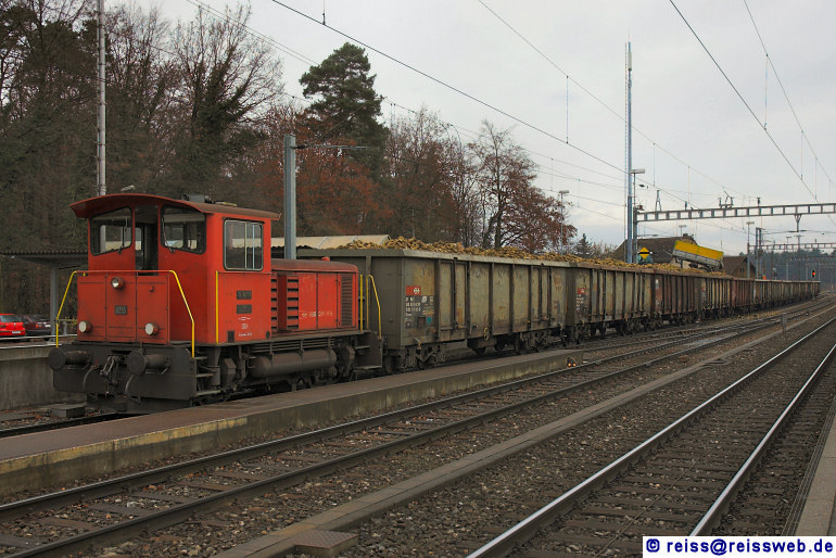 Ein lange Reihe von Eaos-Wagen für den Zuckerrübentransport hat Tm IV 8755 angehängt, wobei er diese nicht alle auf einmal verschieben muss (Hüntwangen-Wil, 01.12.2007).